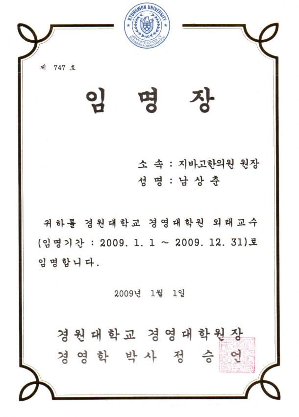 2007, 2008À̾î 2009³â¿¡µµ °æ¿ø´ëÇб³ ¿Ü·á±³¼ö¸¦ ÀÓ¸í¹Þ¾Ò½À´Ï´Ù.